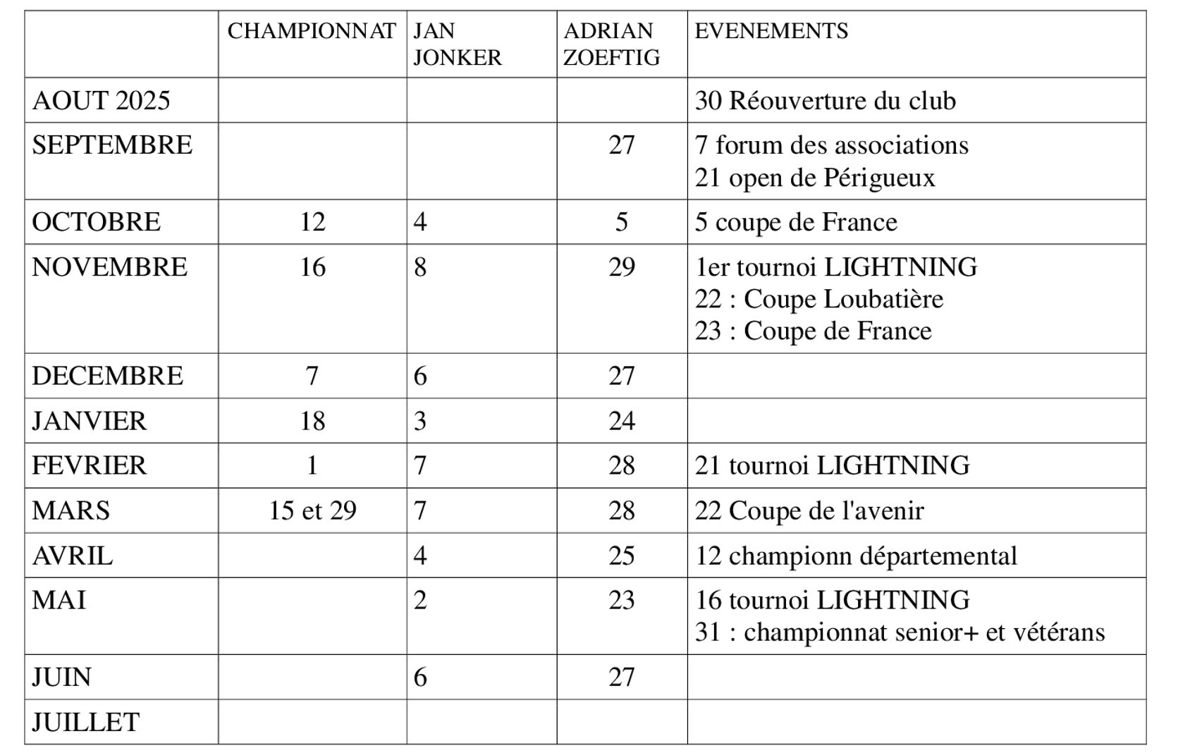 Ci-dessous le calendrier prévisionnel de la saison 25-26