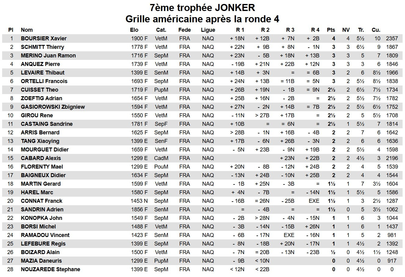 Commençons par le Trophée Jan Jonker qui bat son plein, avec les résultats à la ronde 4 : bon nombre des anciens titulaires et co-titulaires de la coupe caracolent en tête, mais cette fois accompagnés par trois joueurs qui font leur entrée dans la compétition. Xavier Boursier invaincu tient le 1er échiquiers tandis que le jeune Thibaut Levaire (dont le ELO affiché est trompeur...) et le très jeune Théo Cuisset guettent le podium. Encore bien des rondes restent à venir, et la compétition est acharnée !