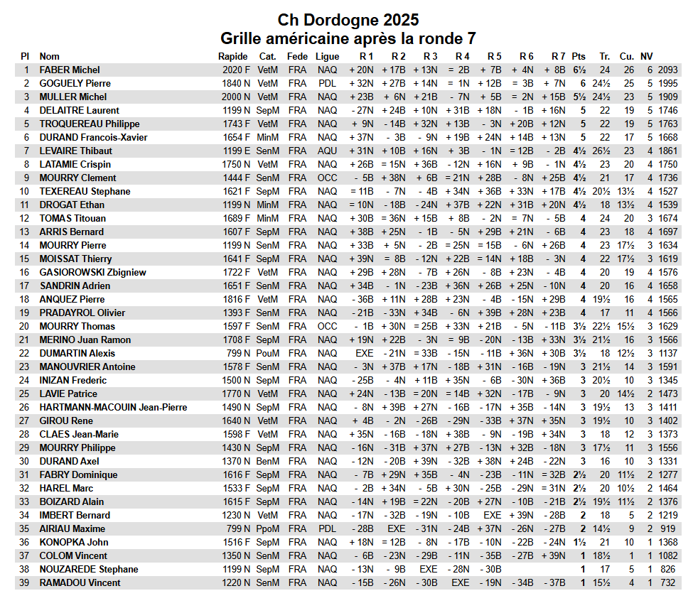 Sans surprise, Michel FABER, meilleur ELO du tournoi, remporte le titre de Champion de Dordogne avec un score presque parfait de 6,5/7 ne concédant qu'une partie nulle et remportant toutes les autres parties.